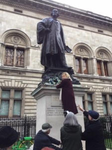 This year’s Wreath laying and AGM coincided with a large scale celebration of the Chinese New Year of the Pig, so while Imogen Irving was able to lay the traditional wreath, any speeches were rather drowned out by a combination of fire-crackers and oriental pop-music from the portable stage in Charing Cross Road.